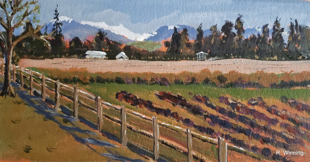 Vancouver mountains and a Farm Description: Painted at Kirkland House Ladner BC | 8 x 10 | Not Available